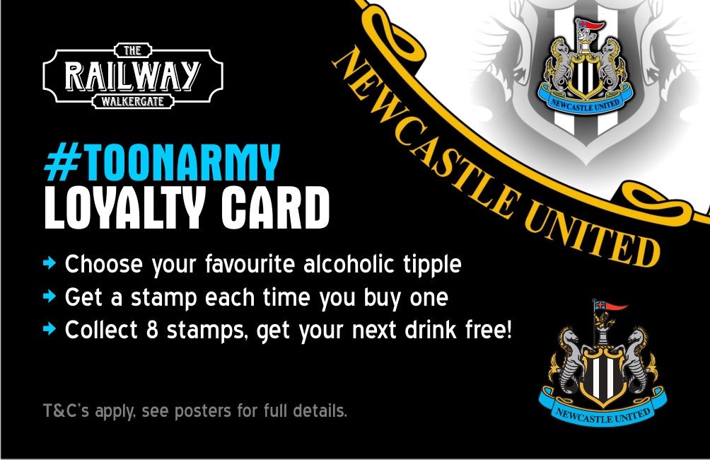 All day long on NUFC matchdays, get a stamp each time you purchase your favourite tipple at the bar. Collect 8 stamps and get your next drink free!